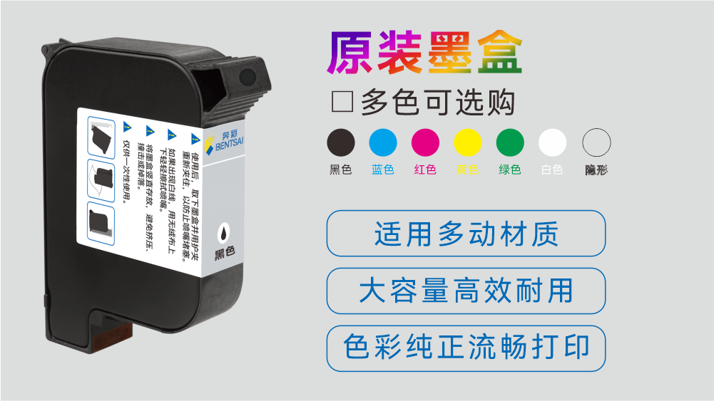 产品型号:快干P系列,快干T系列 喷印材质:纸箱,木头,石膏板,纤维板等吸水性材质 墨盒颜色:黑,蓝,红,黄,绿,白色