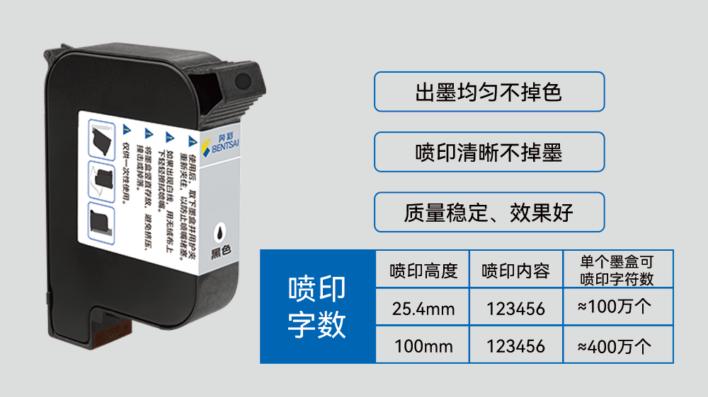 - 干燥时间 3~5秒(300x300DPI 12.7mm字体) (板材上测试)